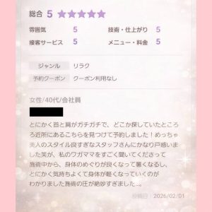 とっても嬉しいクチコミで、イナダは施術にご満足頂けたことにとても喜んでおりましたが、